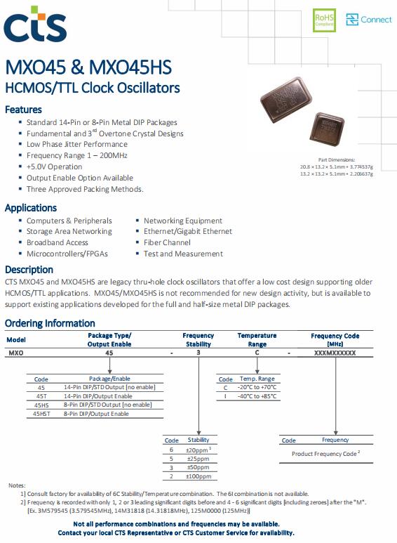 | MXO45-3C-13M0000 | CTS晶振 | MXO45 | 13MHz | 5V | ±50ppm | -20°C ~ 70°C |