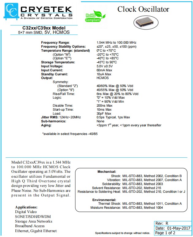 Crystek瑞斯克C3290晶振,C3290-14.318180時鐘振蕩器,C3290-16.000,7050mm晶振,參數(shù)圖