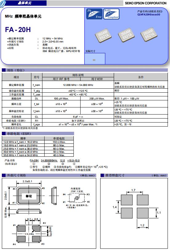 | Q24FA20H00223 | 2.5 x 2 x 0.55mm | FA-20H | 30.000000 MHz | 12 pF | -40 to +85 °C |
