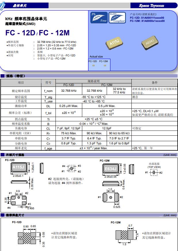 | X1A000061000600 | 2.05 x 1.2 x 0.6 mm | FC-12M | 32.768kHz | 7 pF | -40 to +85 °C |