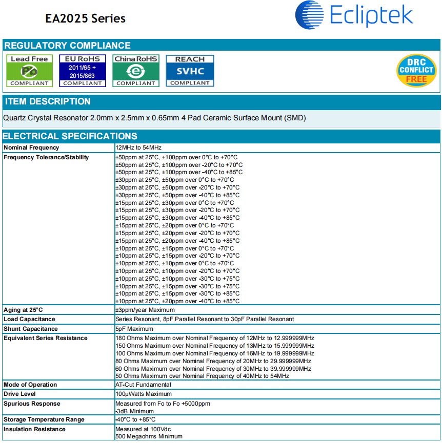 | EA2025JA18-25.000M TR | Ecliptek | EA2025 | MHz 晶體 | 25 MHz |