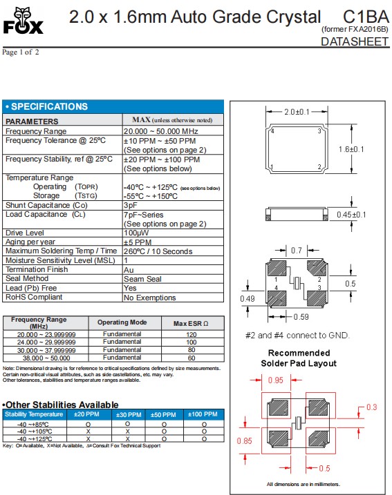 FC1BACBEI50.0-T3|FOX??怂咕д駖2016SMD晶振|50MHz,FC1BACBEI50.0-T3晶振,FOX福克斯晶振,2016mm晶振,進口SMD晶振,頻率50MHz,負載10pf,型號C1BA,耐高溫晶振,抗沖擊晶振,汽車空調控制板晶振,汽車動力轉向控制器晶振,汽車音箱控制器晶振,5G室外基站控制器晶振.
