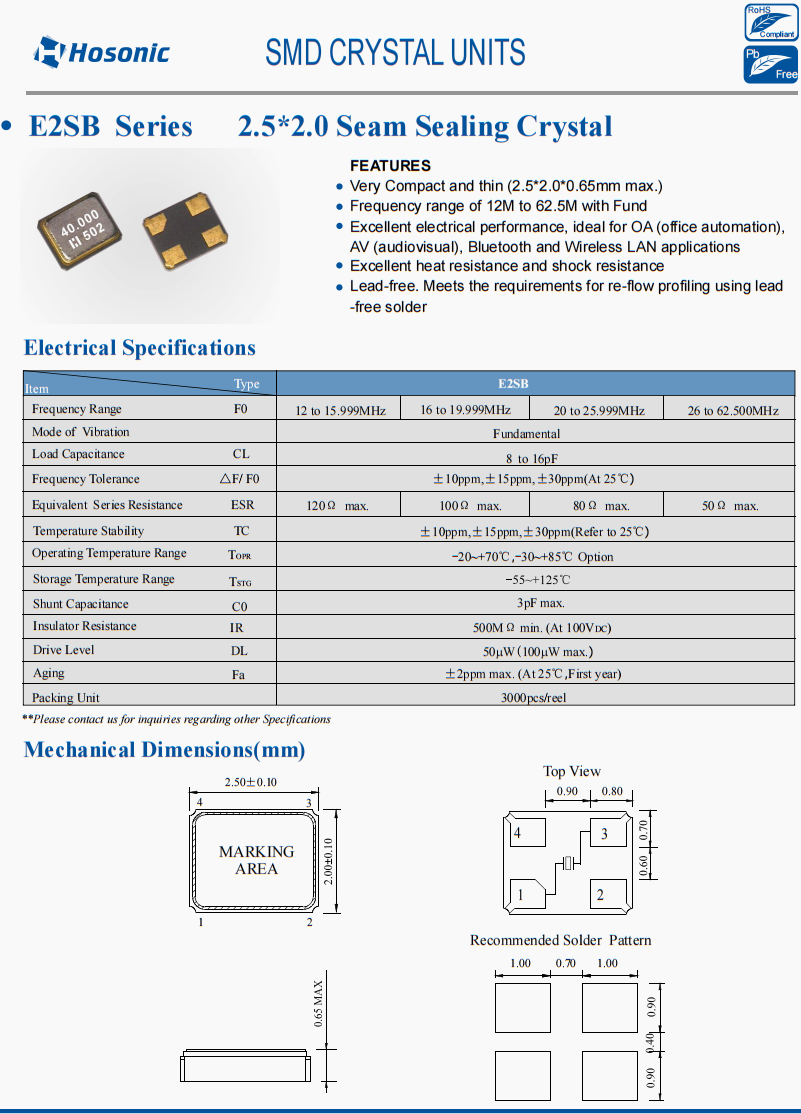 E2SB40E00000RE  Hosonic晶振 E2SB 40 MHz ±30ppm ±30ppm 20pF -40°C ~ 85°C