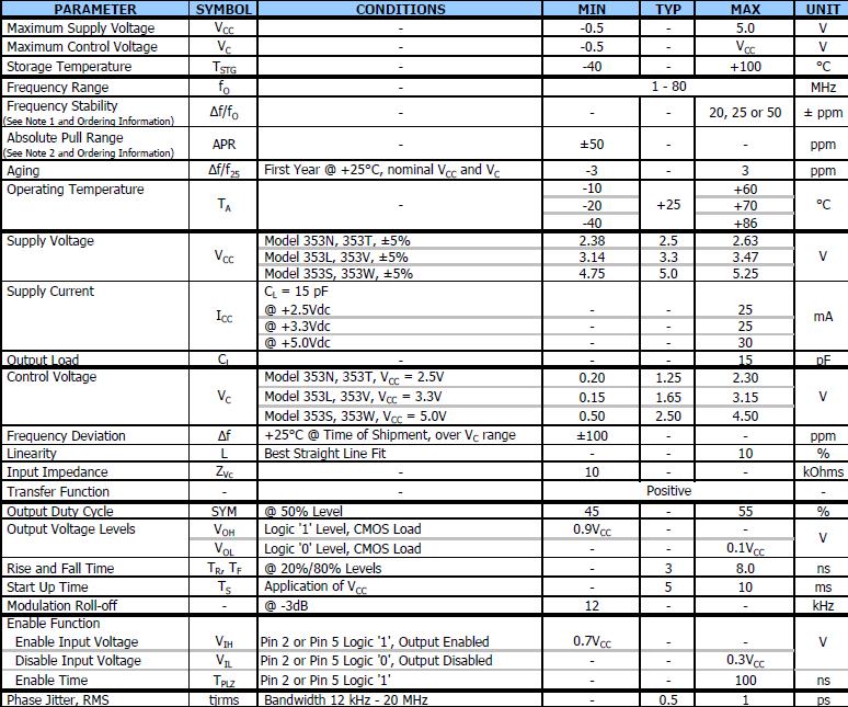 最大的電源電壓VCC - -0.5 - 5.0 V,最大控制電壓VC - -0.5 V電源電壓,儲存溫度測試- -40 + 100°C,頻率范圍fO - MHz頻率穩定度,頻率偏移Δf + 25°C @裝運時間,在VC±100——ppm范圍,允許輸入電壓VIH銷2或銷5邏輯“1”,輸出0.7 vcc——啟用,禁用輸入電壓維爾銷2或銷5邏輯“0”,輸出——0.3 vcc禁用,啟用時間TPLZ銷2或銷5邏輯“1”——- 100 ns,相位抖動,RMS tjrms帶寬12 kHz - 20 MHz - 0.5 - 1 ps.