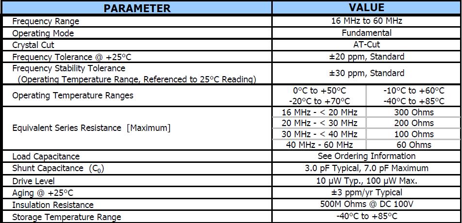 頻率范圍:16.0MHZ~60.0MHZ,操作模式:Fundamental,水晶切割:AT-Cut,頻率公差@ + 25°C:±20 ppm,頻率穩定度公差:±30 ppm(操作溫度范圍,引用到25°C閱讀):0°C + 50°C -10°C + 60°C/-20°C + 70°C -40°C + 85°C,儲存溫度范圍:-40°C to +85°C.在更高或更低溫度或高濕度環境下長時間保存晶體產品時,會影響頻率穩定性或焊接性,請在正常溫度和濕度環境下保存這些晶體產品.