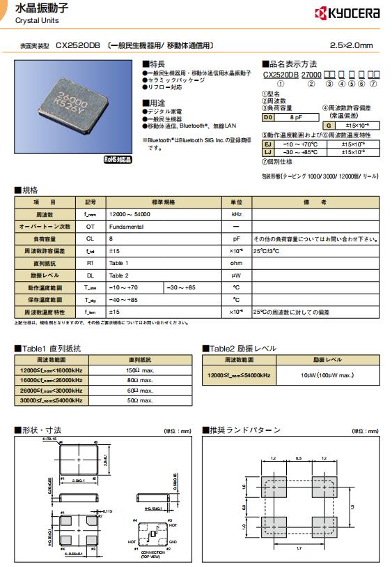 | CX2520DB24000D0FLJCC | AVX 晶振/Kyocera 晶振 | CX2520DB | 24MHz | -30°C~85°C |