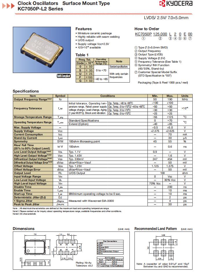 | KC7050Y125.000L20EZU | AVX Corp/Kyocera Corp | KC7050Y-L20EZU | 125MHz | 2.5V | 0°C ~ 70°C |