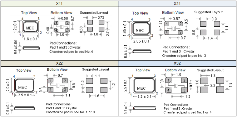 | 項目/型號 | X11 ( 1.6 * 1.2 * 0.4 mm ) | X21 ( 2.0 * 1.6 * 0.5 mm ) | X22 ( 2.5 * 2.0 * 0.6 mm ) | X32 ( 3.2 * 2.5 * 0.7 mm ) |