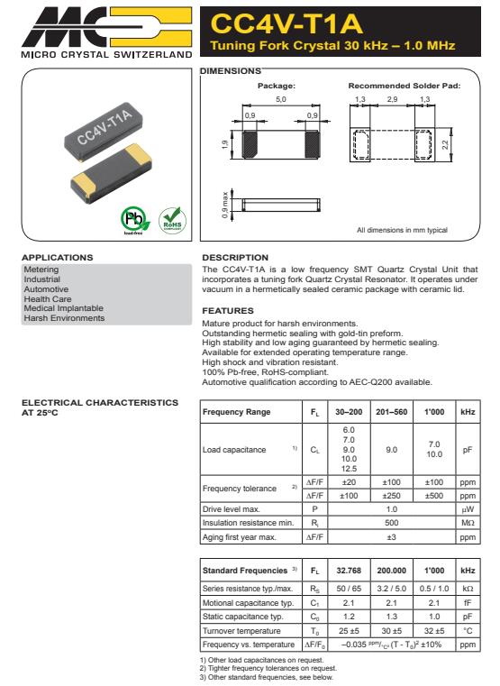 1.CC1V-T1A是一種低頻SMT石英晶體單元結合了一個音叉石英晶體諧振器,它在真空環境下工作,采用密封陶瓷包裝與陶瓷蓋