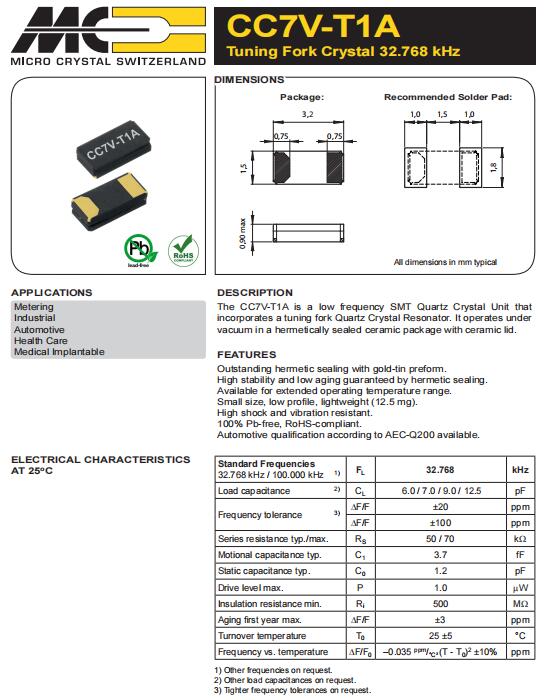 1.CC7V-T1A是一種低頻SMT石英晶體單元結合了一個音叉石英晶體諧振器,它在真空環境下工作,采用密封陶瓷包裝與陶瓷蓋