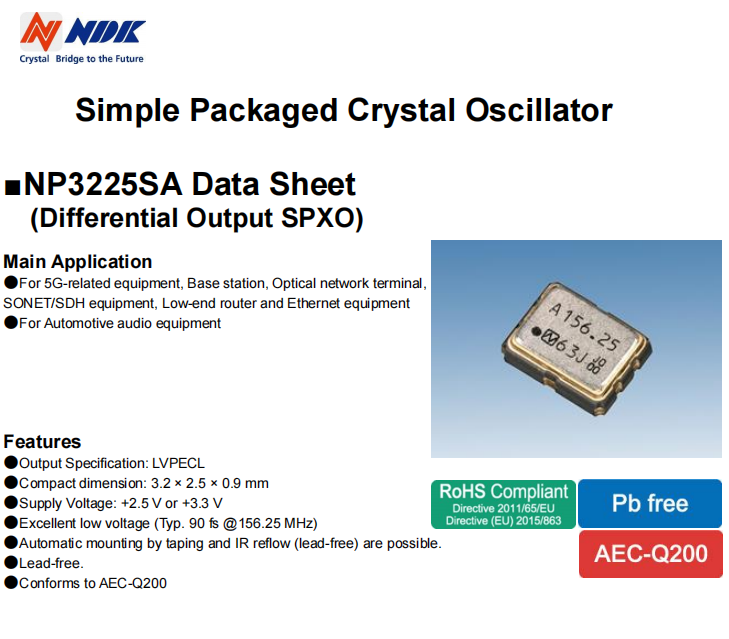 NSC5235A-LVPECL差分晶振-日本NDK有源晶振,NP3225SA貼片晶振,NSC5235A石英晶體振蕩器,LVPECL差分晶振,日本NDK有源晶振,3225mm晶振,頻率212.5MHz,工作溫度-40~85°C,電壓2.5V,頻率穩定性50ppm,6g相關設備晶振,光網絡終端晶振,SONET/SDH設備晶振,低端路由器晶振,以太網設備晶振,汽車音響設備晶振.