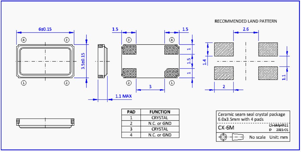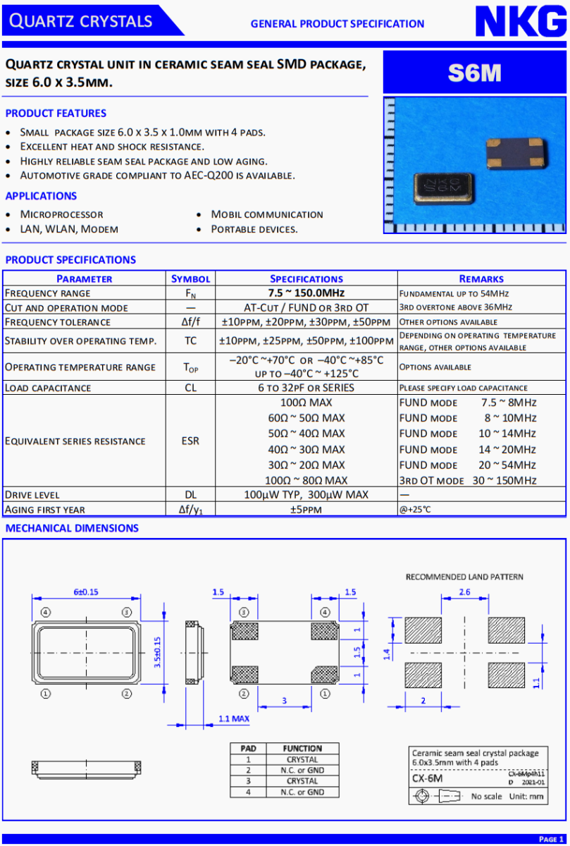 多功能方向盤晶振,NKG晶振,S6M100.0000F18EYY-EXT四腳晶振。石英晶體單元在陶瓷縫密封SMD封裝,尺寸6.0 x 3.5mm。S6M。產品特點:小包裝尺寸6.0 x 3.5 x 1.0mm與4個墊。優異的耐熱性和抗震性。高可靠的縫封封裝,低老化。符合AEC-Q200標準的汽車級產品可供選擇。應用:微處理器,局域網,無線局域網,調制解調器,移動通信,便攜式設備。NKG晶振公司,無線傳輸晶振,汽車藍牙晶振,移動通訊晶振,石英晶振,高品質晶振,低損耗晶振,汽車級晶振,車載音響系統晶振,便攜設備晶振,USB存儲設備晶振。4025晶振,小體積晶振,超薄晶振,貼片晶振,進口晶振,