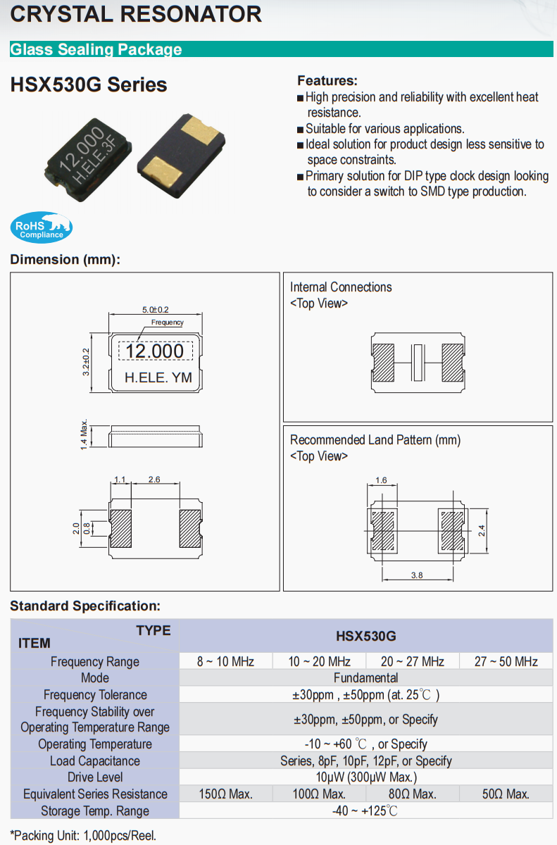 | X1H012000FK1H | 加高晶振 | HSX531S | 12 MHz | ±30ppm | ±50ppm | 7pF | -10°C ~ 85°C |