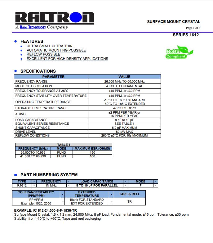 | Raltron原廠編碼 | 型號 | 頻率 | 尺寸 | 頻率偏差 | 頻率穩定度 | 負載 |