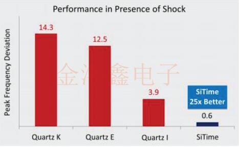 沖擊力和振動力會降低性能,并導致石英振蕩器發生故障.晶體諧振器是懸臂結構,可能對機械力非常敏感,并且容易產生相位噪聲和振動引起的抖動,以及沖擊引起的頻率尖峰.相反,MEMS諧振器的振動較小,因為其質量比石英諧振器低1000至3000.這減小了由振動引起的加速度施加到諧振器的力.SiTime MEMS諧振器是剛性結構,可在體模式下在平面內振動,其固有的抗振動性.