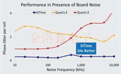 與石英振蕩器相比,具有精心設計的模擬電路的MEMS振蕩器對EM噪聲不那么敏感.石英振蕩器封裝上的金屬蓋不能保證免受電磁力的影響.EMS的性能更多地取決于固有的諧振器阻抗和耦合機制以及振蕩器的模擬電路設計.基于標準的測試表明,SiTime可編程振蕩器的性能優于其他時鐘設備,如圖3所示. 系統中的電源可能是不利于系統性能的主要噪聲源,并且在打開和關閉電源時會放大此噪聲.大部分噪聲可以通過無源濾波器和去耦電容器濾除.但是,仍然存在一些噪聲,電路板問題(例如接地反彈)會對時鐘抖動產生負面影響.電源噪聲靈敏度(PSNS)是模擬電路設計中使用的參數,它指示電路對電源噪聲的魯棒性.測試結果表明,SiTime振蕩器的PSNS遠遠優于石英晶振,包括設計用于滿足高頻,低抖動要求的石英表面聲波(SAW)振蕩器.