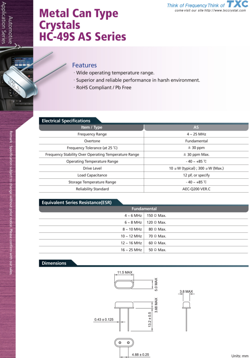 TXC49S晶體,車載收音機晶振,AS-4.194304MAHE-B晶振,臺灣TXC晶振公司,金屬罐類型晶體HC-49SAS系列,特點:工作溫度范圍寬。惡劣環境下性能優越可靠。符合RoHS指令/不含Pb.貼片晶振,超小型晶振,小型汽車晶振,車載收音機晶振,實時時鐘晶振,汽車級晶振,無源晶振,車載USB晶振,高精度晶振,耐高溫晶振,高品質晶振,臺產晶振,49S晶振,插件晶振,低成本晶振