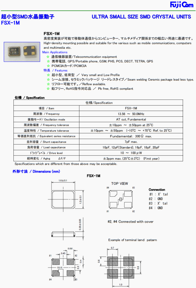 | FCX1M04032012E3J | Fuji晶振 | FCX-1M | 40.32 MHz | ±30ppm | ±20ppm | 12pF | -20°C ~ 70°C |