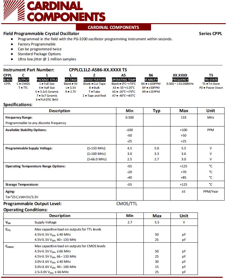 | CPPC7-B6-5.0TS | Cardinal晶振 | OSC XO 5.000MHZ CMOS SMD | XO (Standard) | 5MHz | CMOS | ±100ppm | 0°C ~ 70°C |