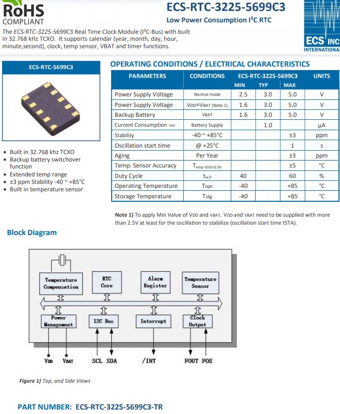 ECS-RTC-3225-5699C3是一款小型實時時鐘 (RTC),具有嵌入式 32.768kHz晶振 TCXO,穩定性為 ±3 ppm。