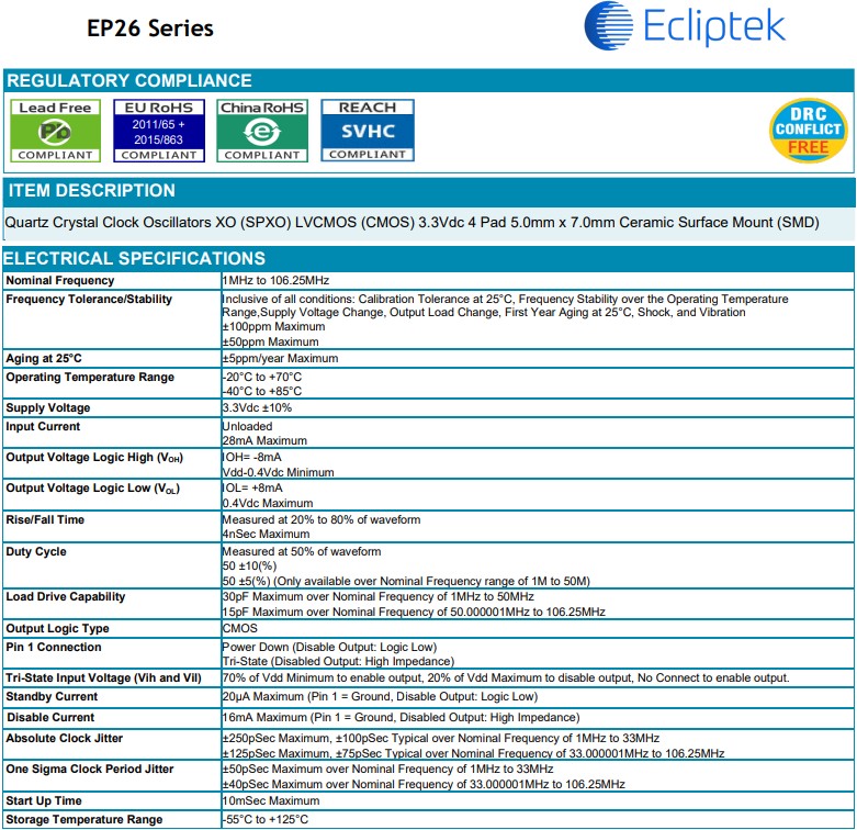 Ecliptek日蝕晶振公司成立于1987年,是一家石英晶振晶體,貼片晶振頻率元件控制市場上公認的領導者.日蝕晶振公司擁有先進的產品和領先的技術使我們能夠為客戶提供最好的石英晶體,貼片晶振,石英水晶和有源晶振,石英晶體振蕩器,貼片振蕩器產品.日蝕晶振EP26系列,編碼EP2600TS-40.000M,石英晶體時鐘振蕩器