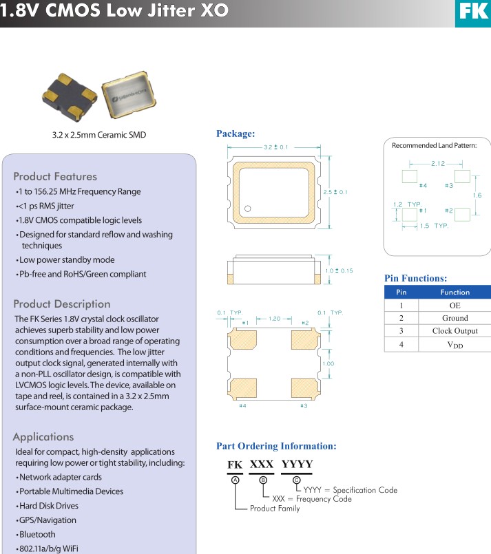 FK系列1.8V晶體時鐘振蕩器實現(xiàn)極好的穩(wěn)定性和低功率消費范圍廣,經(jīng)營范圍廣條件和頻率。低抖動輸出時鐘信號,內(nèi)部產(chǎn)生非鎖相環(huán)振蕩器的設計,是兼容的LVCMOS邏輯水平的SPXO振蕩器。該設備,可用于磁帶和卷軸,包含在一個3.2 x 2.5mm陶瓷表面包。