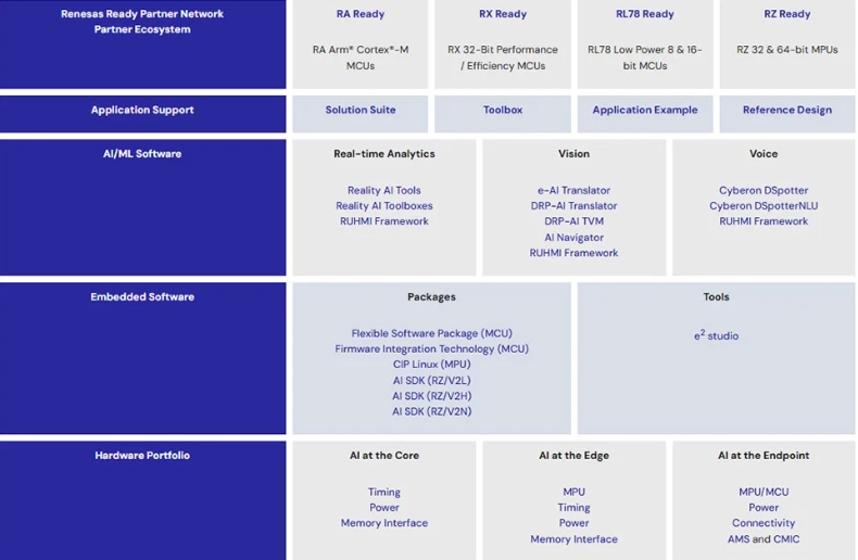 瑞薩電子深知,一個完整的AI開發生態系統對于推動AI技術發展和應用落地的重要性.因此,公司構建了一套全面且完善的AI開發系統,為開發者提供從數據收集,模型訓練到部署應用的全鏈條支持.在開發工具方面,瑞薩提供了直觀易用的E-AI工具鏈和RealityAlTools.E-AI工具鏈能夠幫助開發者將現有AI模型輕松遷移到瑞薩平臺上,而RealityAlTools則為開發者提供了從數據到模型的一站式開發服務,大大縮短了開發周期,提高了開發效率.在硬件產品上,如前文所述,RA8MCU系列和RZ/VMPU產品線等豐富的MCU/MPU產品,為不同類型和規模的AI應用提供了多樣化的硬件選擇,滿足了各種復雜應用場景的需求.瑞薩還擁有豐富的解決方案資源庫,其中包含了大量的應用示例,工具箱,解決方案套件和硬件參考套件等.這些資源就像一座寶藏庫,開發者可以從中獲取靈感,借鑒成熟的經驗,快速搭建起自己的AI應用原型.例如,在智能家居領域,瑞薩提供的智能語音控制家居自動化解決方案,詳細展示了如何利用瑞薩的硬件和軟件資源,實現語音識別,智能控制等功能,幫助開發者快速進入智能家居AI應用的開發領域.此外,瑞薩還積極構建廣泛的合作伙伴網絡,與眾多行業領先的企業,科研機構和開發者社區建立了緊密的合作關系.通過與合作伙伴的深度協作,瑞薩能夠整合各方優勢資源,共同開發出更具創新性和競爭力的AI解決方案.這些合作伙伴不僅提供了商業級的解決方案,還在技術交流,市場推廣等方面與瑞薩攜手共進,共同推動AI技術在各個領域的普及和應用.總之,瑞薩完善的AI開發系統,就像一個強大的"AI孵化基地",為開發者提供了全方位的支持和保障,助力他們快速實現從原型到應用的轉化,加速AI技術的創新與發展.