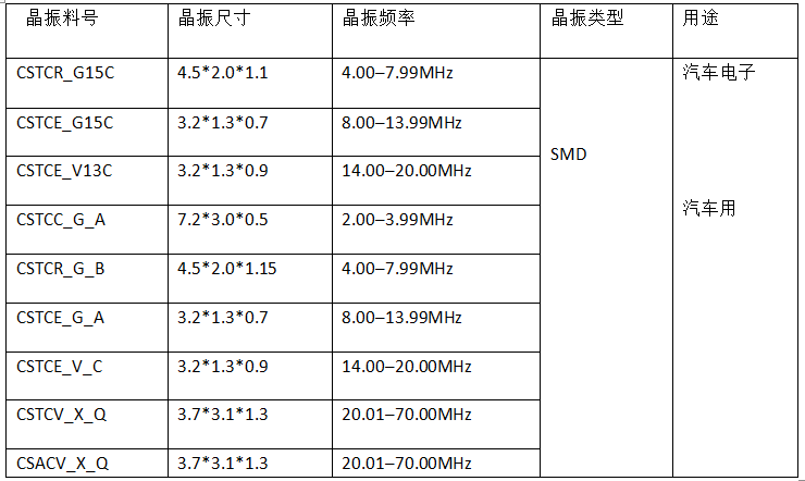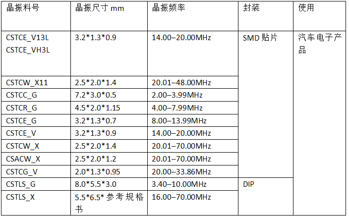 對(duì)于陶瓷晶振大家應(yīng)該不陌生,通常我們?cè)谵k公室看到的電話座機(jī)就會(huì)使用到陶瓷晶振,還有家有的遙控電路模塊也會(huì)使用到ZTT(三腳)和(ZTA)兩腳陶瓷晶振。那么接下就是給大家盤(pán)點(diǎn)一些汽車專用的村田貼片晶振與插件晶振的參數(shù),需要的可以拿個(gè)小本本記下來(lái)哦 村田晶振配備內(nèi)藏負(fù)載電容器的緊湊封裝型片狀“CERALOCK(陶瓷振動(dòng)子)”可保證極高的精確度,頻率的調(diào)整和表面封裝專有的技術(shù),實(shí)現(xiàn)了負(fù)載電容器內(nèi)藏片狀“CERALOCK”,振蕩電路無(wú)需任何外部連接負(fù)載電容器,內(nèi)部采用了村田先進(jìn)技術(shù)添加的內(nèi)部負(fù)荷電容,適用溫度低溫可到-40℃至120℃符合現(xiàn)實(shí)汽車內(nèi)置的高溫環(huán)境正常工作,產(chǎn)品具有外觀尺寸小,超薄,很適合汽車電子防盜遙控等小型產(chǎn)品應(yīng)用。