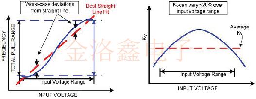 通常以kHz/伏特,MHz/伏特,PPM/伏特或類似單位表示.根據PLL設計中使用的術語,斜率通常稱為"KV".基于石英晶振的標準VCXO的FV特性斜率可能會在輸入控制電壓范圍內發生較大變化,通常為10-20%.一些數據手冊可能會指定一個"平均"Kv作為典型值,但由于Kv影響重要的PLL性能參數,例如帶寬和相位裕量,因此,在成功的設計中必須了解并考慮整個Kv變化.