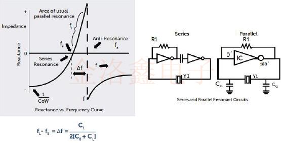 晶體的電抗曲線揭示了發(fā)生機(jī)械共振的位置.串聯(lián)諧振發(fā)生在曲線過(guò)零的點(diǎn).在這一點(diǎn)上,晶體似乎是一個(gè)被電容分流的簡(jiǎn)單電阻.通過(guò)在晶體上串聯(lián)或并聯(lián)增加電容[負(fù)載],會(huì)發(fā)生并聯(lián)諧振,從而導(dǎo)致正頻移.