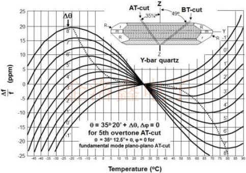 可以選擇三個(gè)不同的角度來(lái)優(yōu)化不同范圍內(nèi)的性能.較低的角度可用于-20℃~+70℃的溫度范圍,應(yīng)選擇較大的角度以適用于較寬的溫度范圍.在給定的溫度范圍內(nèi),在更嚴(yán)格的公差(較小的ppm偏移)范圍內(nèi)的性能受到曲線本身以及角度切割精度的限制.好的切割精度可以低至1至2分鐘,而測(cè)量精度則可以精確至0.1分鐘.與該過(guò)程有關(guān)的擴(kuò)散和為3分鐘以上的時(shí)間增加的成本增加了成本.曲線允許對(duì)溫度范圍的公差進(jìn)行理論限制.注意不要指定不可能的情況.