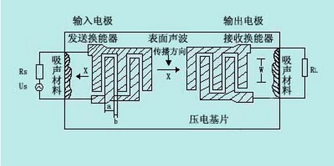這種濾波器的基片是由壓電材料(如鈮酸鋰或石英晶體)制成,在基片上蒸鍍兩組“叉指電極”,一般由金屬薄膜用光刻工藝刻成。左側(cè)接信號(hào)源的一組稱為發(fā)送換能器,右側(cè)接負(fù)載的一組稱為接收換能器,圖中a、b分別為電極寬度和極間距離,W為相鄰叉指對(duì)的重疊長度,稱為“叉指孔徑”。當(dāng)交變的電信號(hào)us加到發(fā)送換能器的兩個(gè)電極上時(shí),通過反壓電效應(yīng),基片材料就會(huì)產(chǎn)生彈性形變,這個(gè)隨信號(hào)變化的彈性波,即“聲表面波”,它將沿著垂直于電極軸向(圖中x方向)向兩個(gè)方向傳播,一個(gè)方向的聲表面波被左側(cè)的吸聲材料吸收,另一方向的聲表面波則傳送到接收換能器,由正壓電效應(yīng)產(chǎn)生了電信號(hào),再送到負(fù)載RL。但叉指換能器的形狀不同時(shí),濾波器對(duì)不同頻率信號(hào)的傳送與衰減能力就會(huì)不一樣。